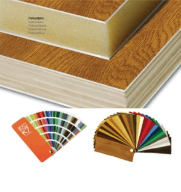 Painel constituído por 2 chapas em PVC termoformado, com núcleo interior formado por compósito hidrófugo de madeira – poliestireno extrudido – compósito hidrófugo de madeira (HDF – XPS – HDF)